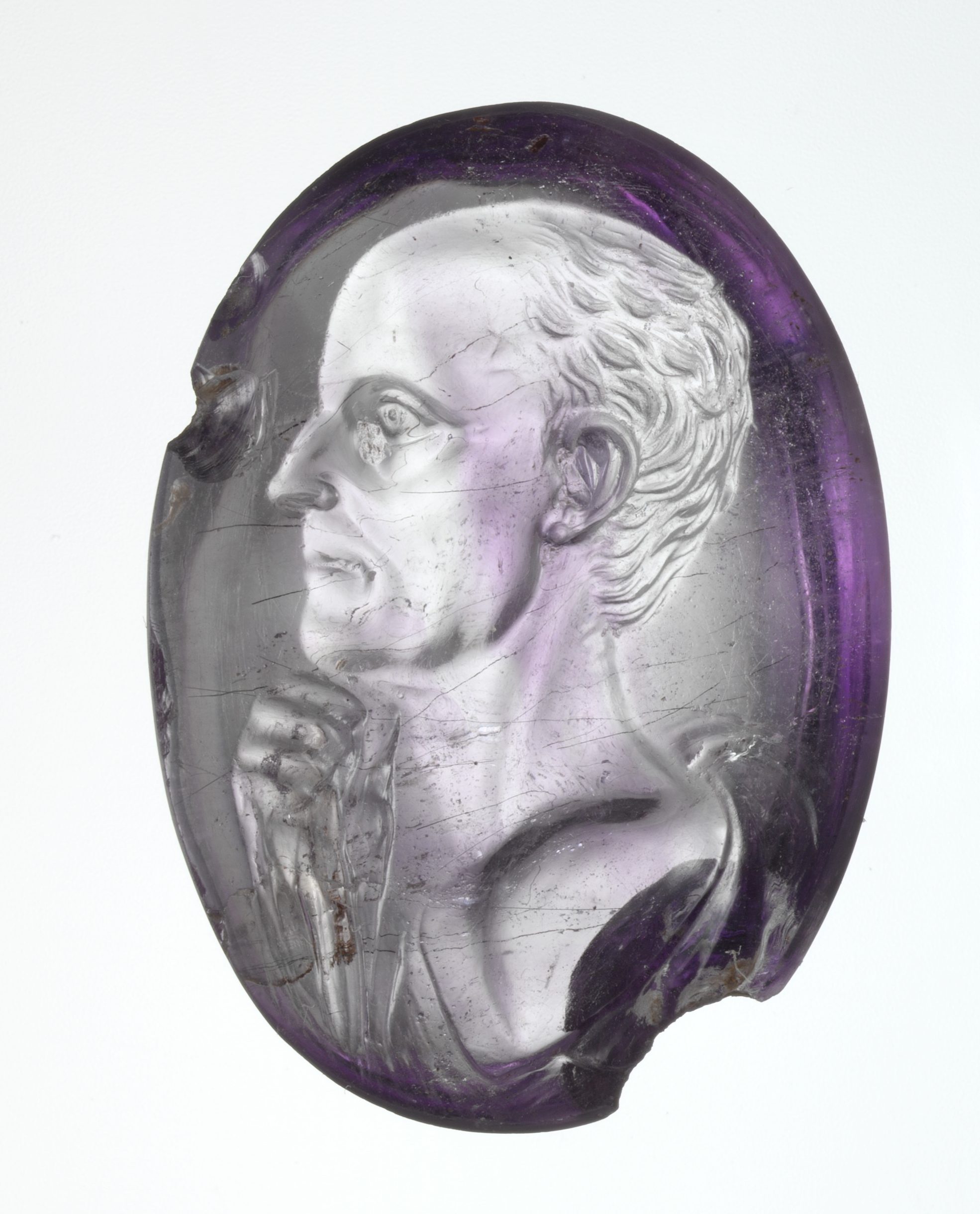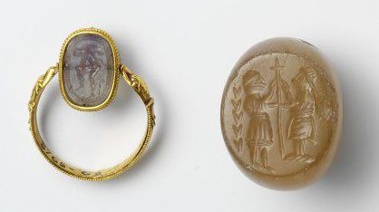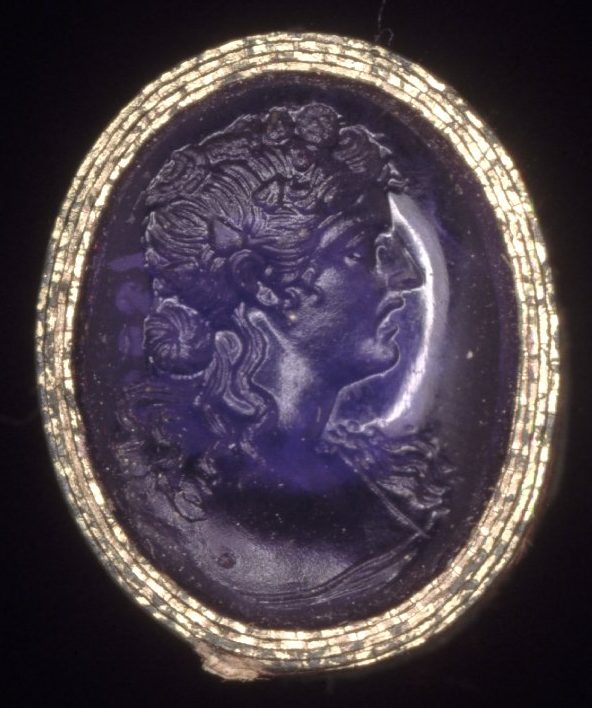 Vertical oval cameo/intaglio. Pale purplish translucent amethyst bead, pierced through and attached with revolving pin to gold ring. One side is domed and carved in the form of a scarab beetle. The other side is flat and depicts a faun or satyr with a short tail, naked except for a cloak flying from his shoulders. He is standing on his right leg facing right, his left leg drawn up possibly in order to adjust his sandle. In the field a shepherd’s crook. Hatched border. Set in a gold ring. Victoria and Albert Museum