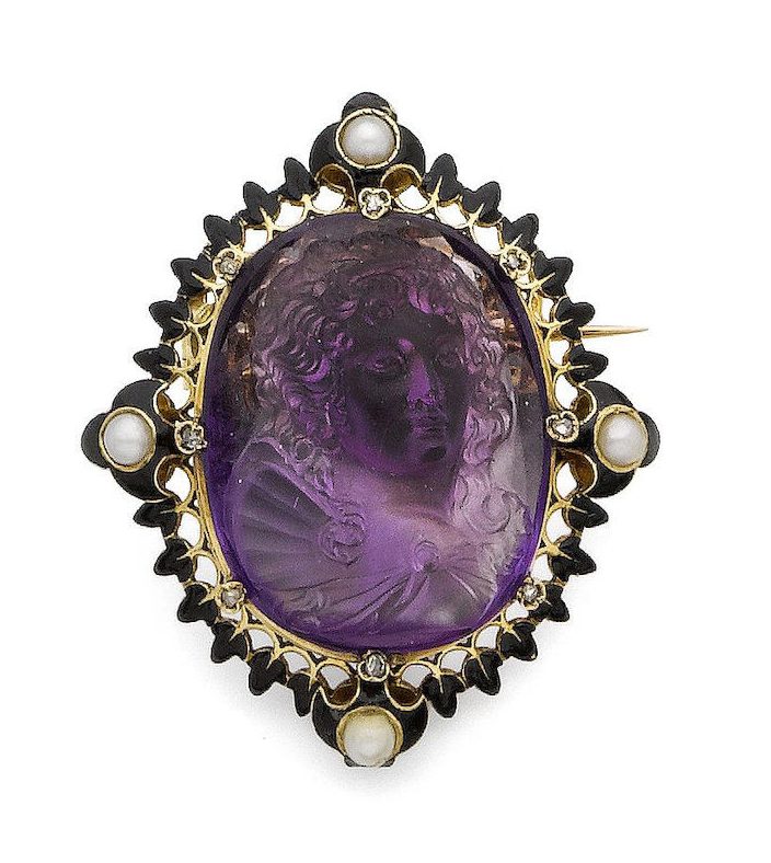 The amethyst cameo carved to depict a maiden in profile within a surround of black enamel set with half-pearls and rose-cut diamond highlights, indistinct maker’s mark, French assay marks, length 4.5cm. Sold for £2,500 at Bonhams