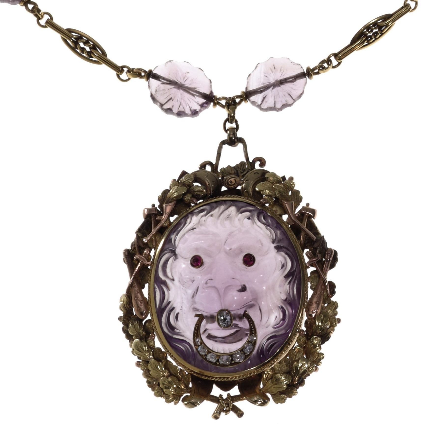 The carved amethyst lion, light purple, set with cabochon ruby eyes, holding an old mine-cut diamond ring in it’s mouth, within a rose and yellow gold foliate frame decorated with a club, sabre, ax and horn, the reverse set with an oval glass in gold frame, opening as a locket, minor repair evident, suspended from a carved amethyst and gold link chain, circa 1880’s, 14½ ins., shows signs of normal wear, overall condition good