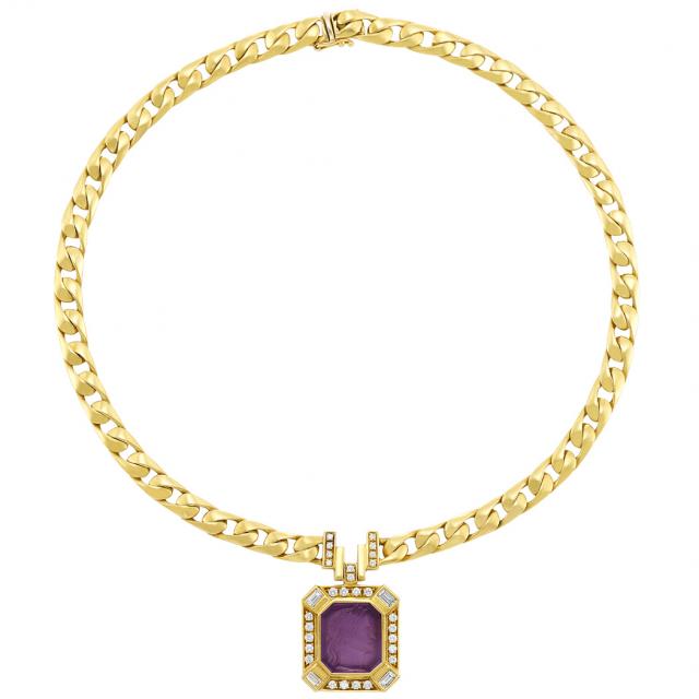 Gold, Amethyst Cameo and Diamond Pendant-Necklace