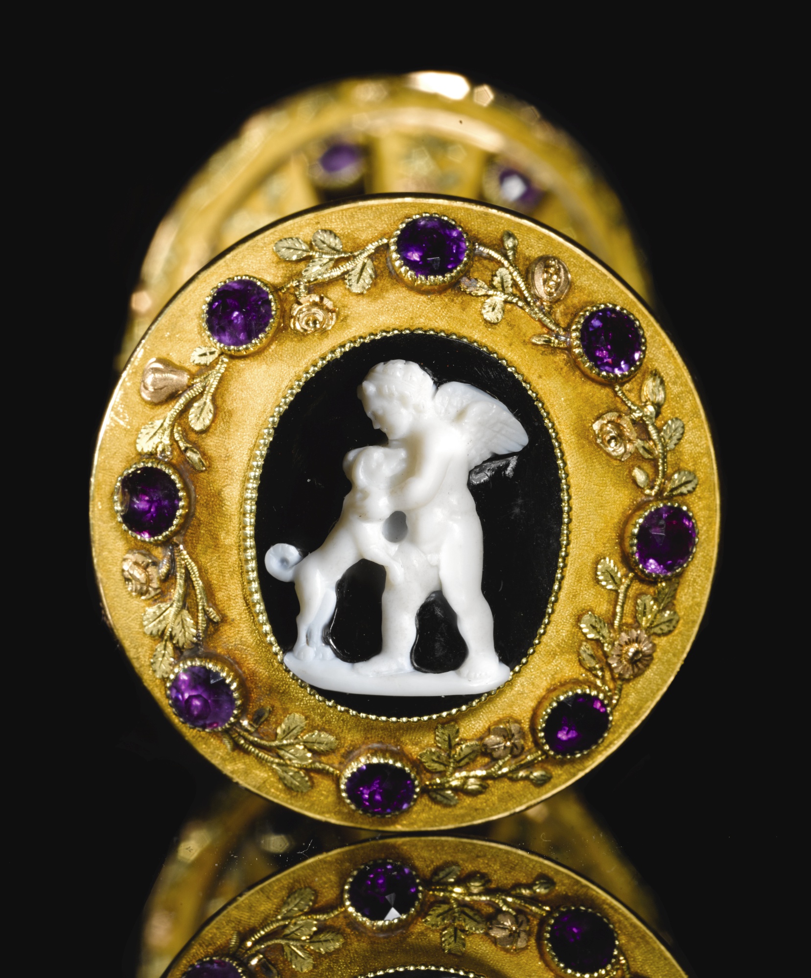 the faceted slightly grey agate stem between gold mounts richly chased with coloured gold rose garlands on a sablé ground, further set with amethysts and surmounted by an onyx cameo of Cupid welcoming a friendly hound, the strip-pierced base similarly decorated and containing the large oval citrine matrix engraved with a coat of arms, unmarked, in a later Victorian leather case stamped ‘Watherston & Son’. Sold for 22,500 GBP at Sothebys