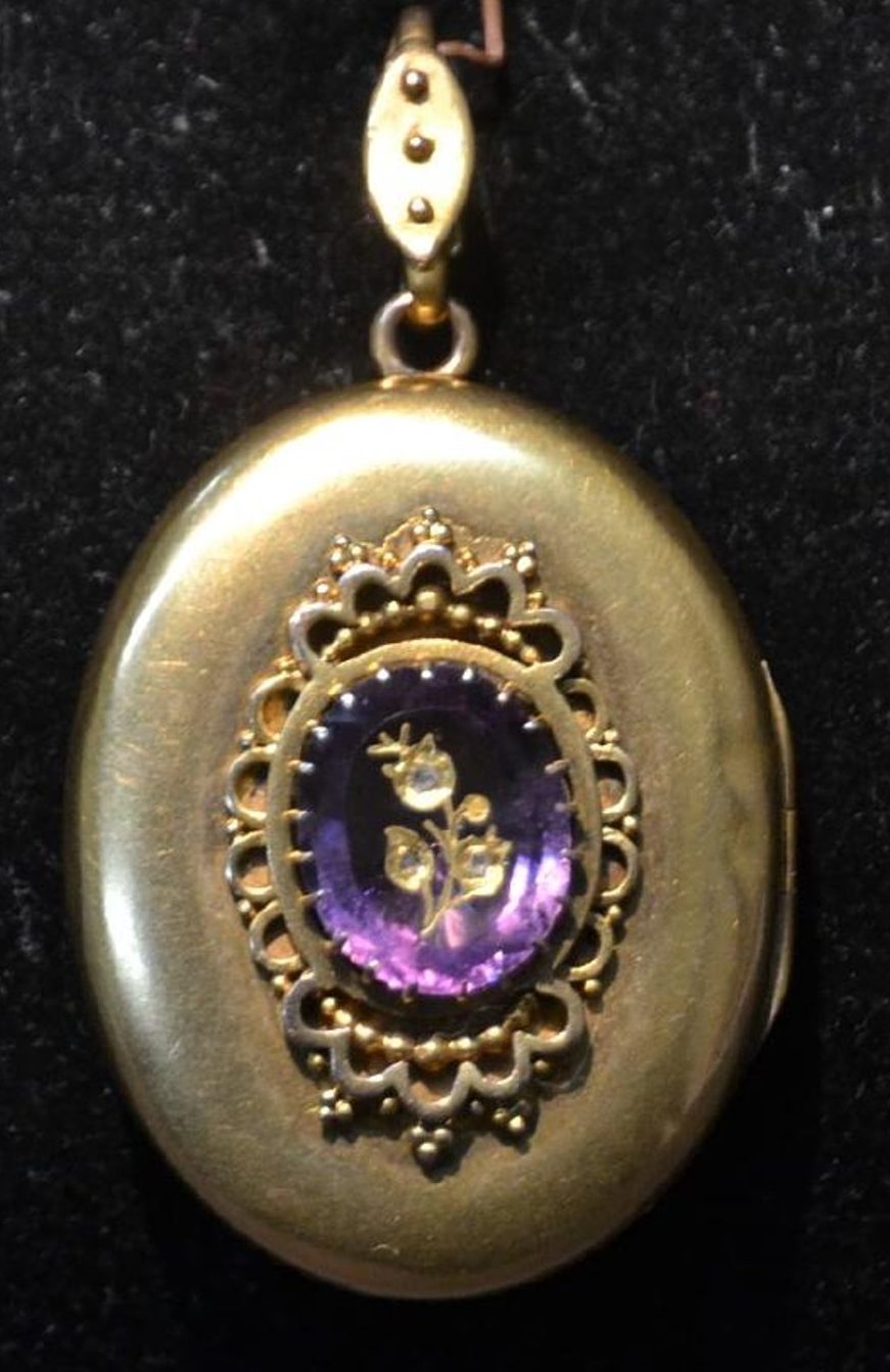 14kt GOLD LOCKET WITH AMETHYST INTAGLIO ROSE. Sold for $300 at Echoes Antiques & Auction Gallery, Inc.