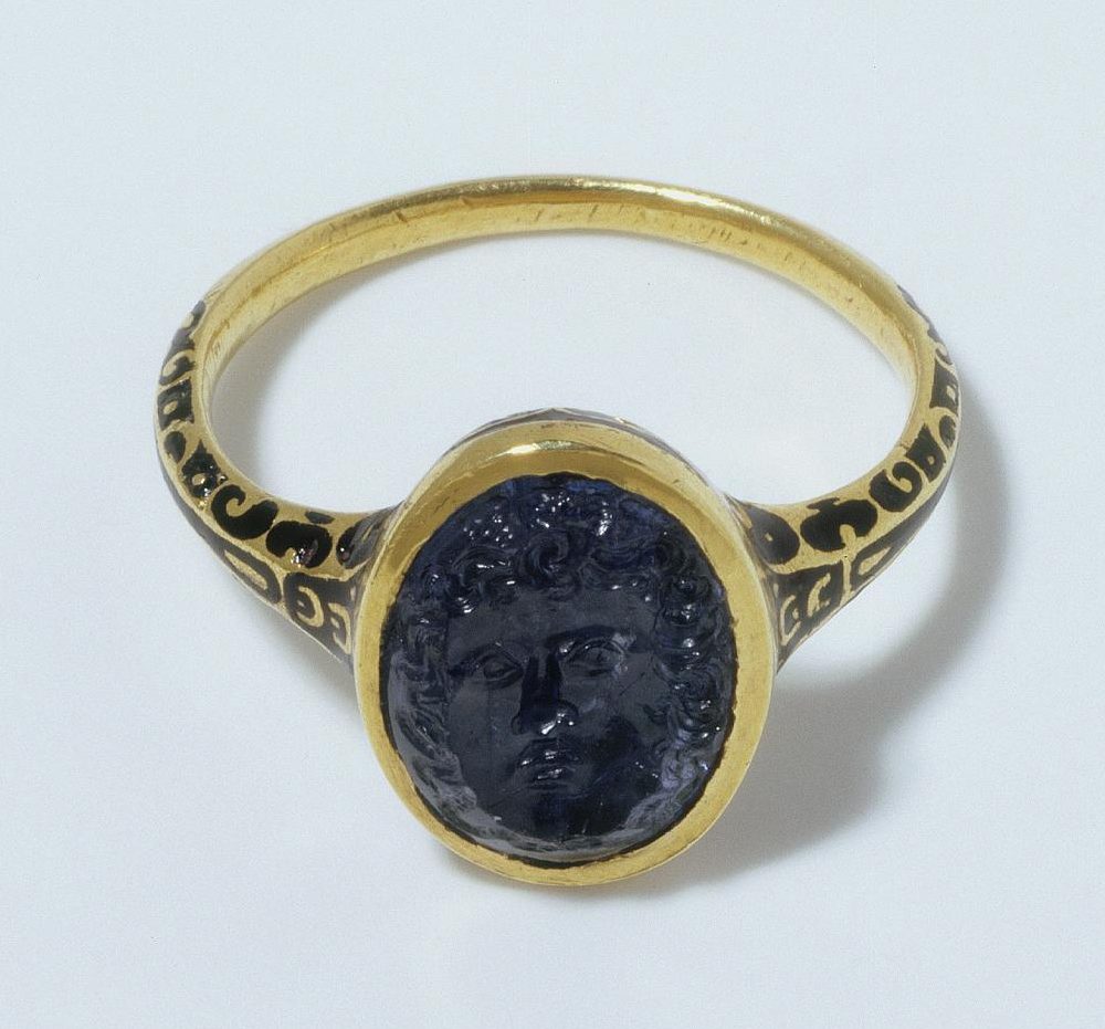 A NECKLACE OF TWELVE ROMAN RINGSTONES CIRCA 1ST CENTURY B.C.-2ND CENTURY A.D. French bronze dore figural mantel clock Oval gem with Perseus holding head of Medusa A gold and mother of pearl snuff box Ring with Perseus