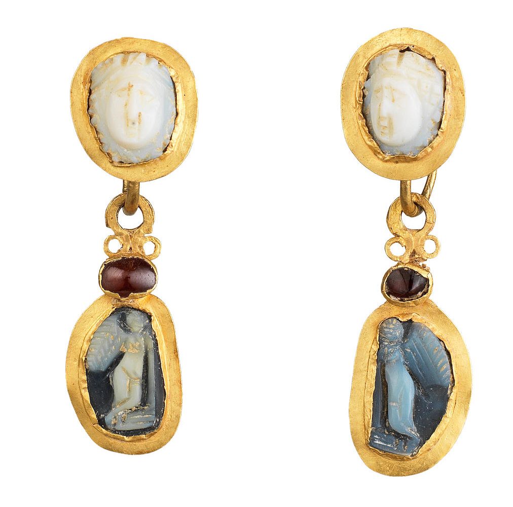 Roman gold earrings Circa 2nd Century A.D Medusa Black and white glass cameo: winged head of Medusa in profile to left